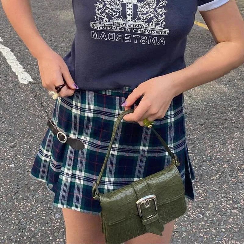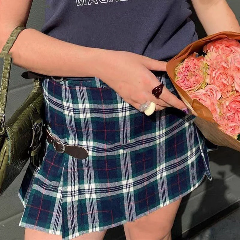 Vintage Plaid Buckle Skirts Women Casual Summer Cute Preppy Cotton Mini Pleated Skirt Female Y2k Streetwear Low Waist Skirts