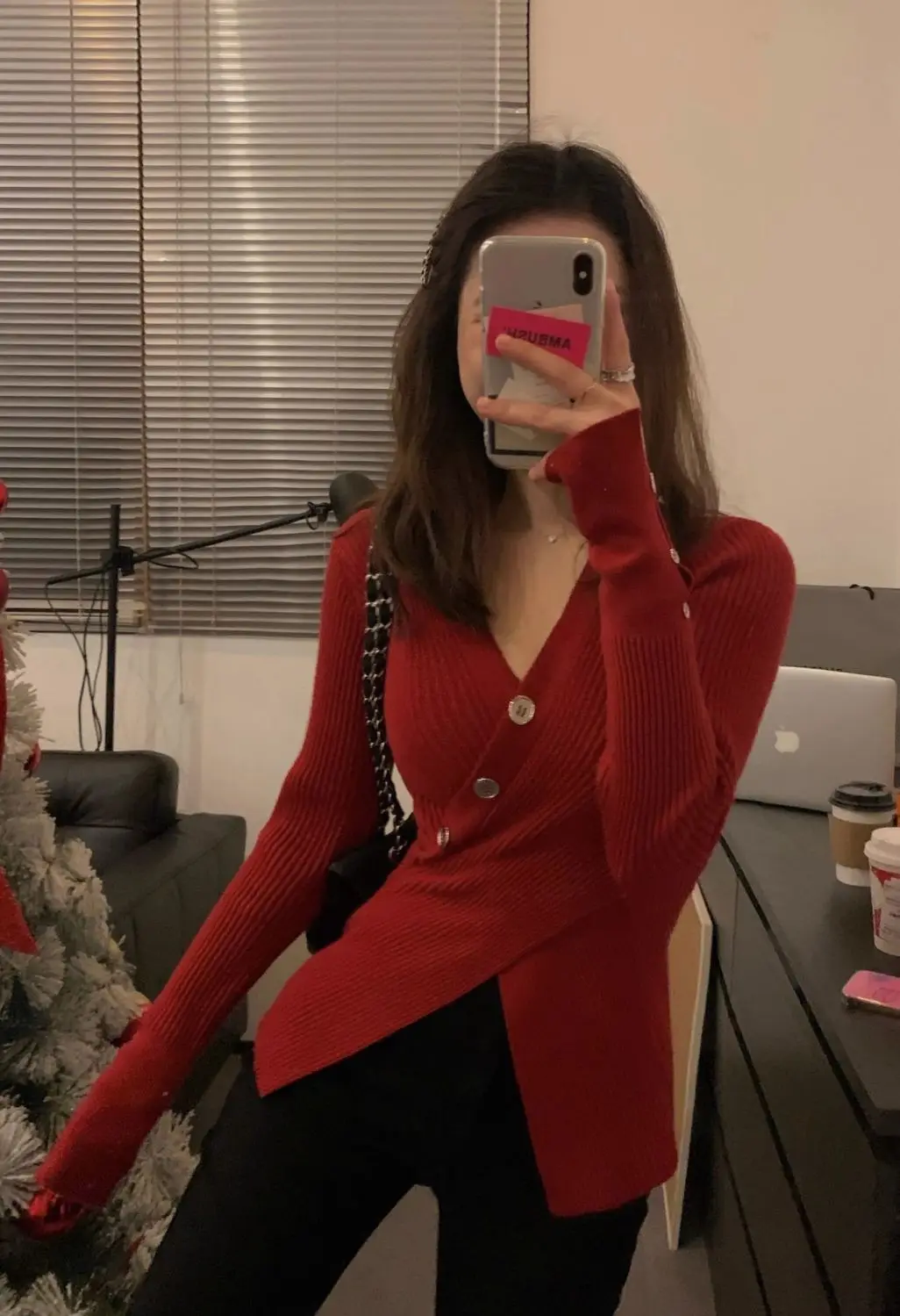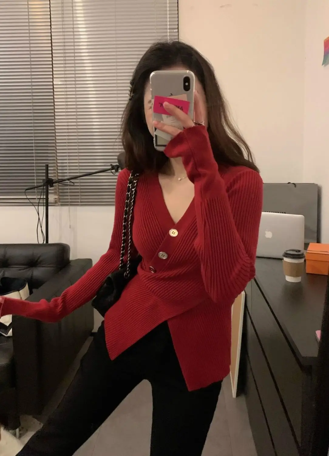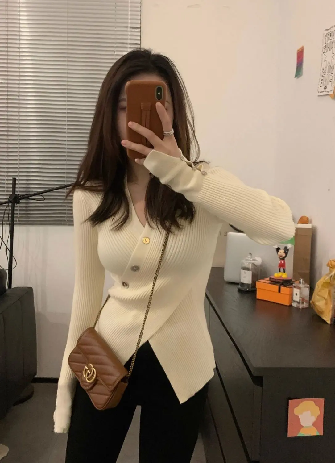 Women Autumn Winter New Irregular V-neck Sweater Trendy Sweet Waist Slim Fit Pullover Knit Shirt Solid Button Long Sleeved Tops