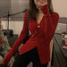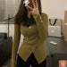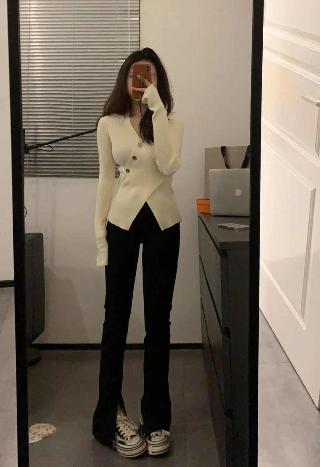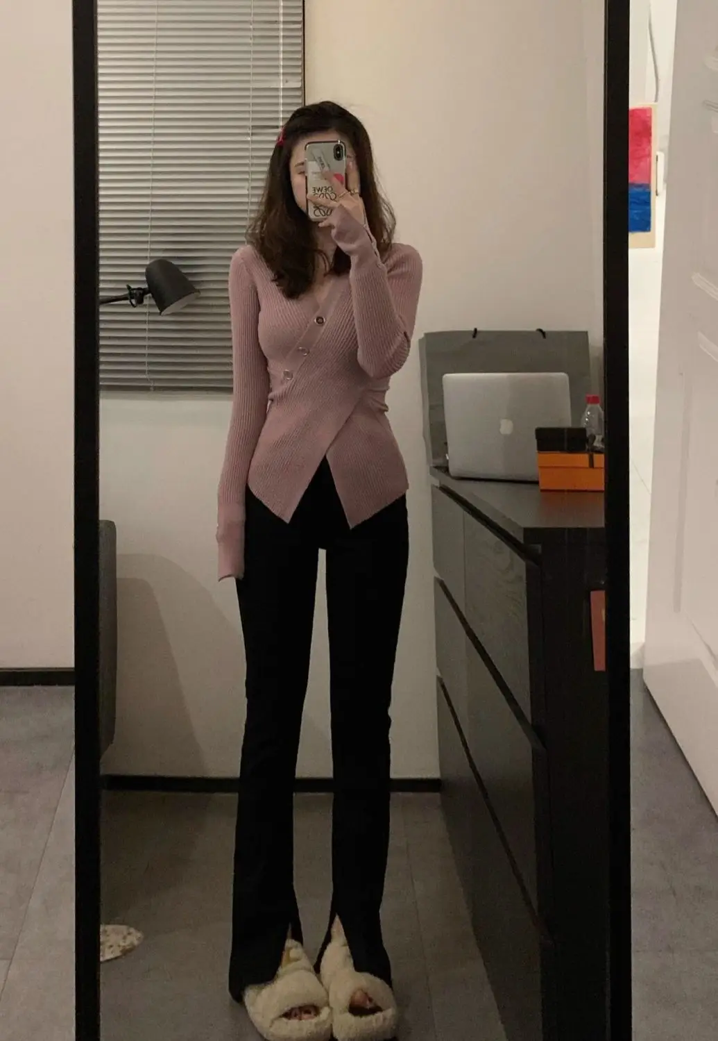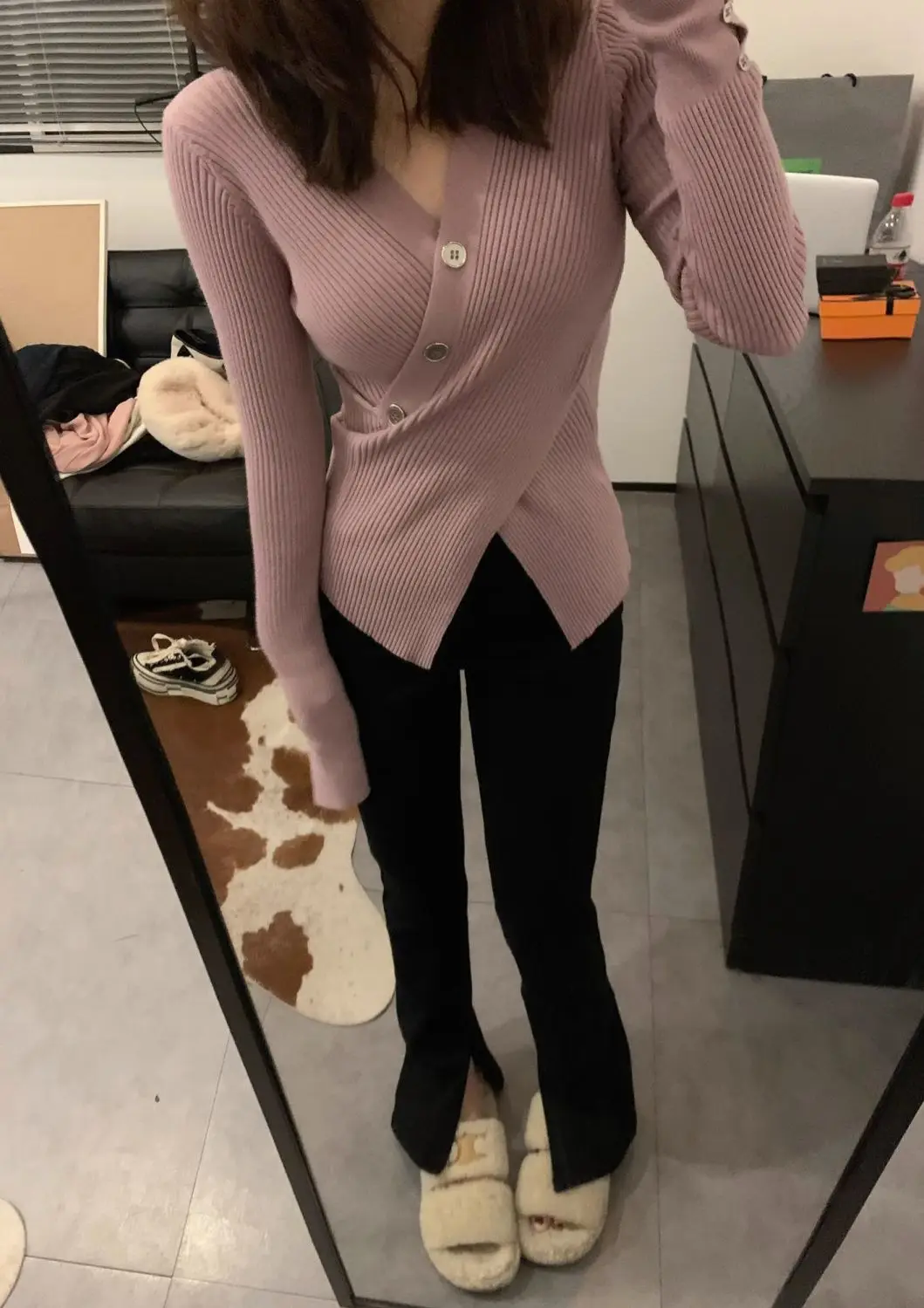Women Autumn Winter New Irregular V-neck Sweater Trendy Sweet Waist Slim Fit Pullover Knit Shirt Solid Button Long Sleeved Tops
