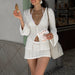 Women Knitted 2 Piece Set Crochet Hollow Out Long Sleeve Button Cardigans Crop Tops + Mini Bodycon Skirt Y2K Vintage Outfit