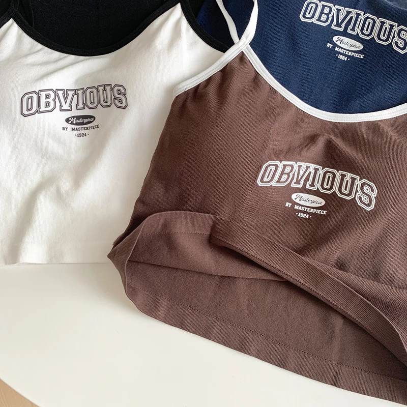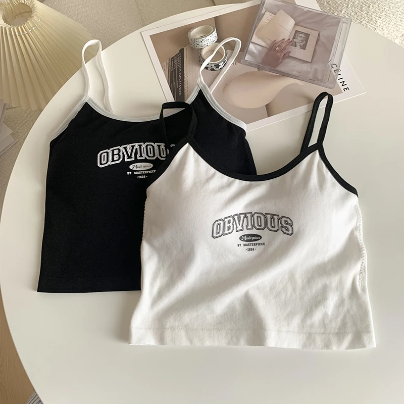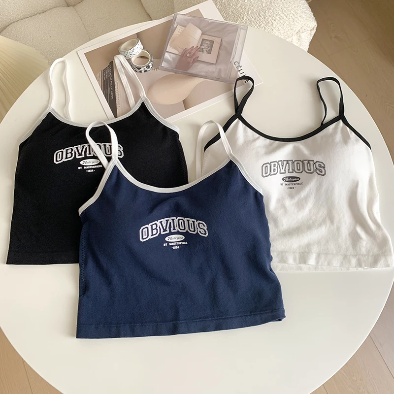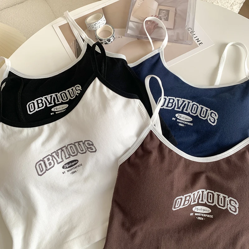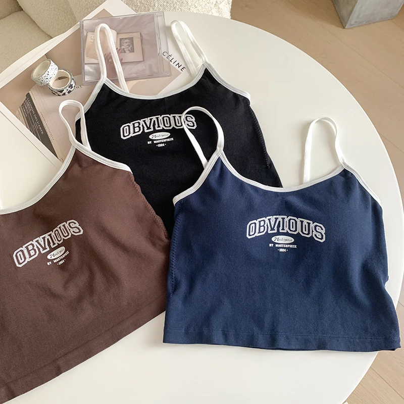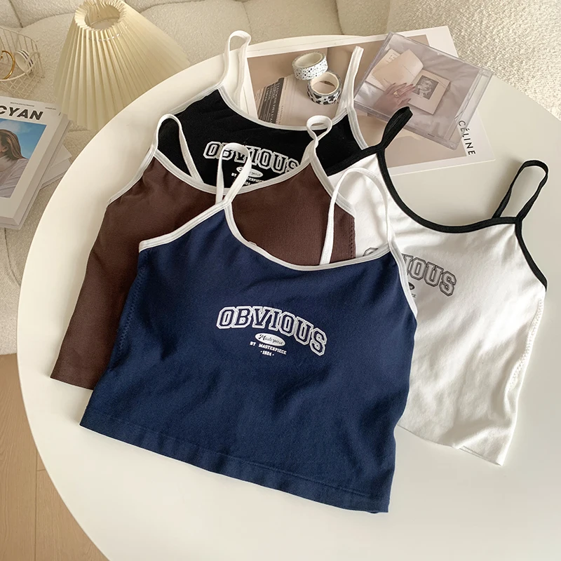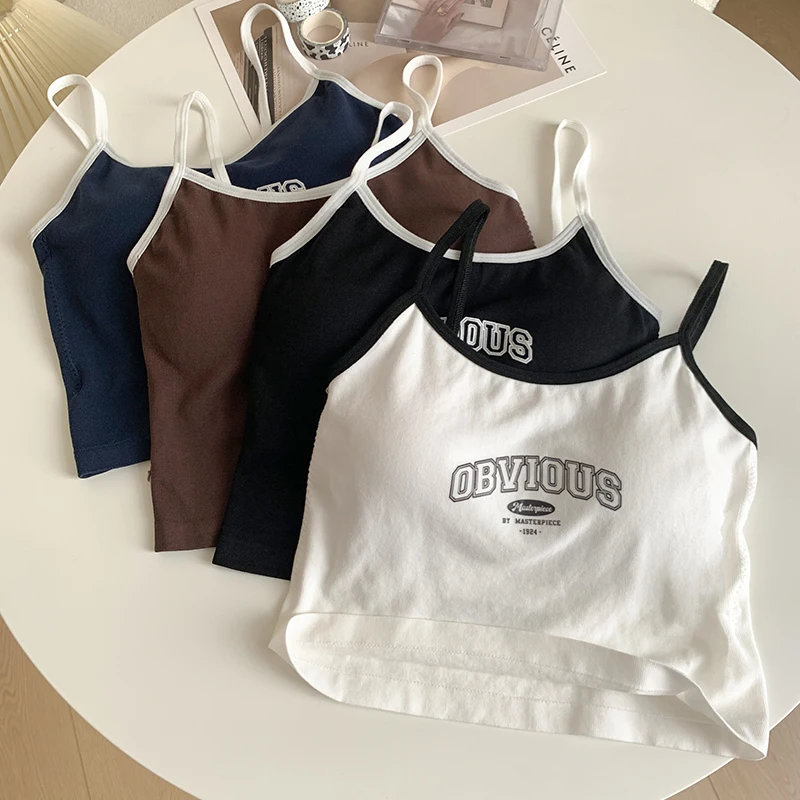 Women With Padded Bra Crop Tops O-neck Solid Crop Tops 2024 Summer Letter Printing Tops Spaghetti Camisole