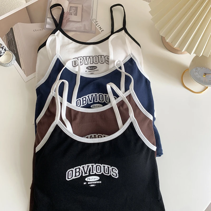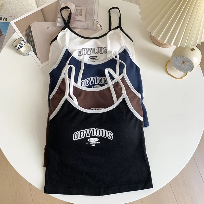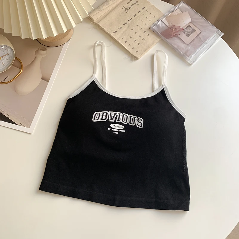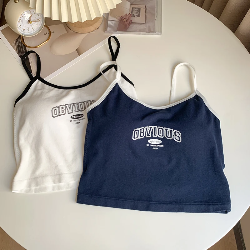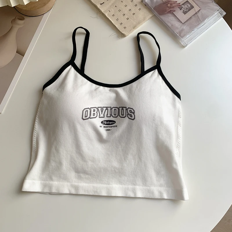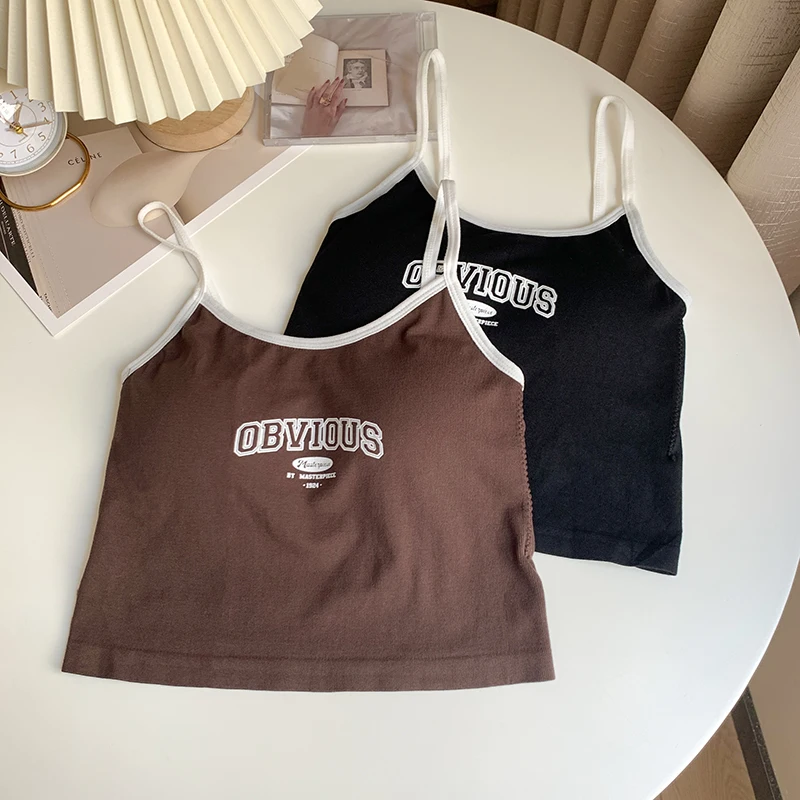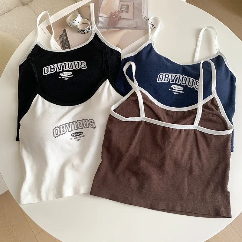 Women With Padded Bra Crop Tops O-neck Solid Crop Tops 2024 Summer Letter Printing Tops Spaghetti Camisole