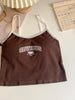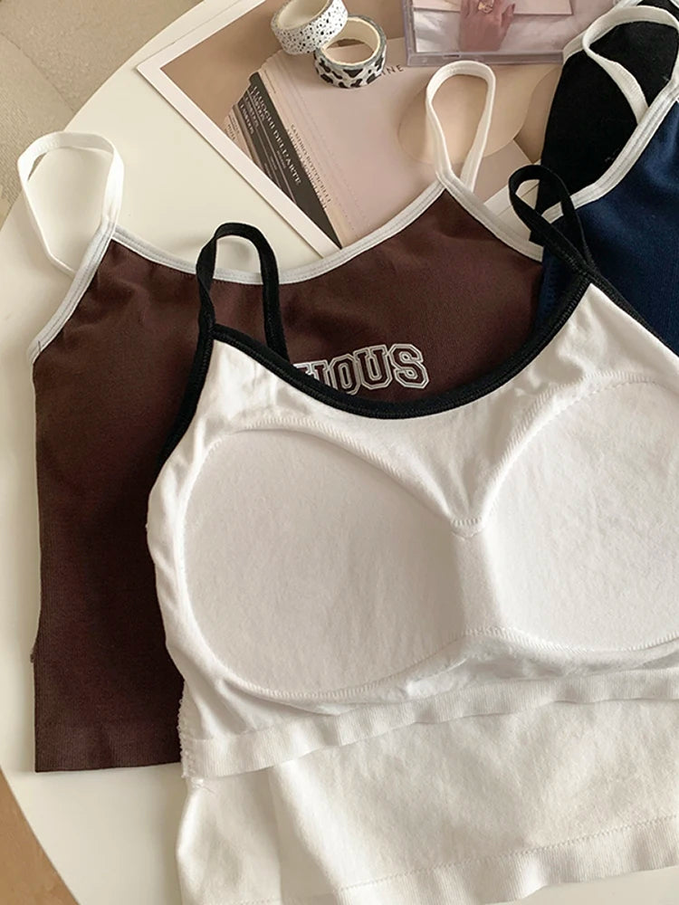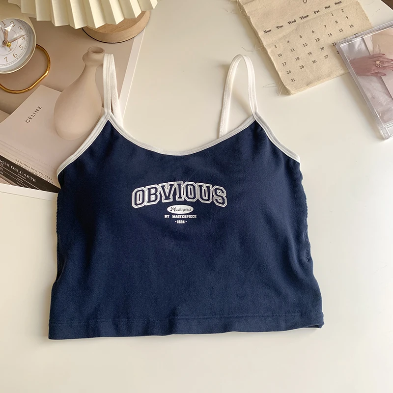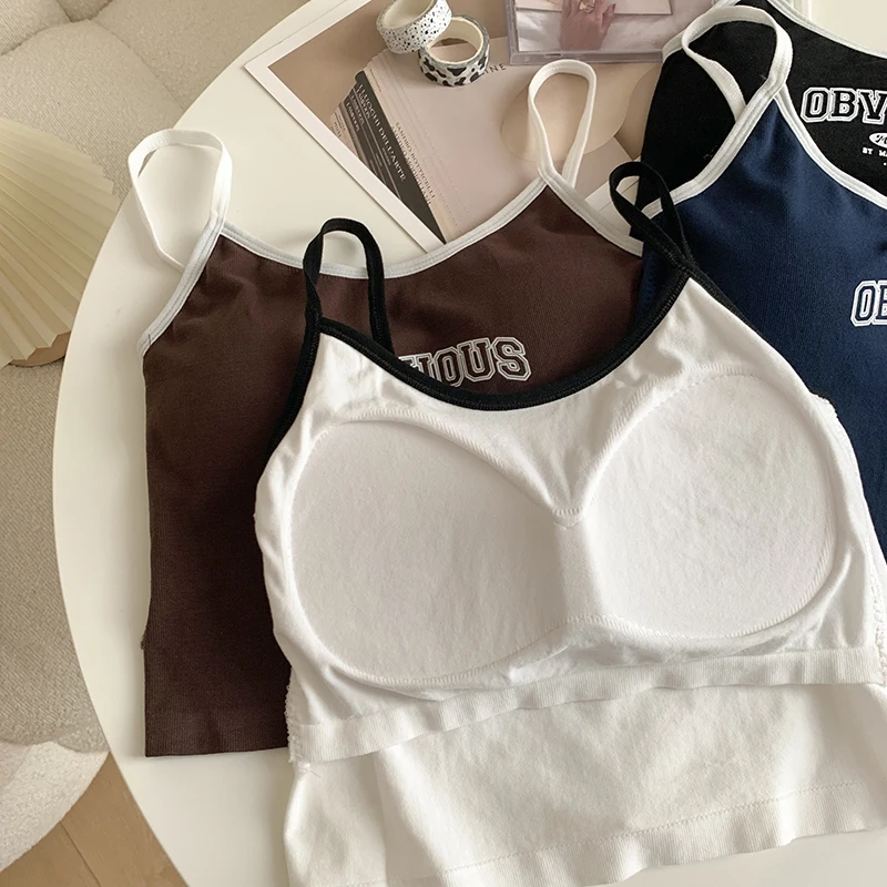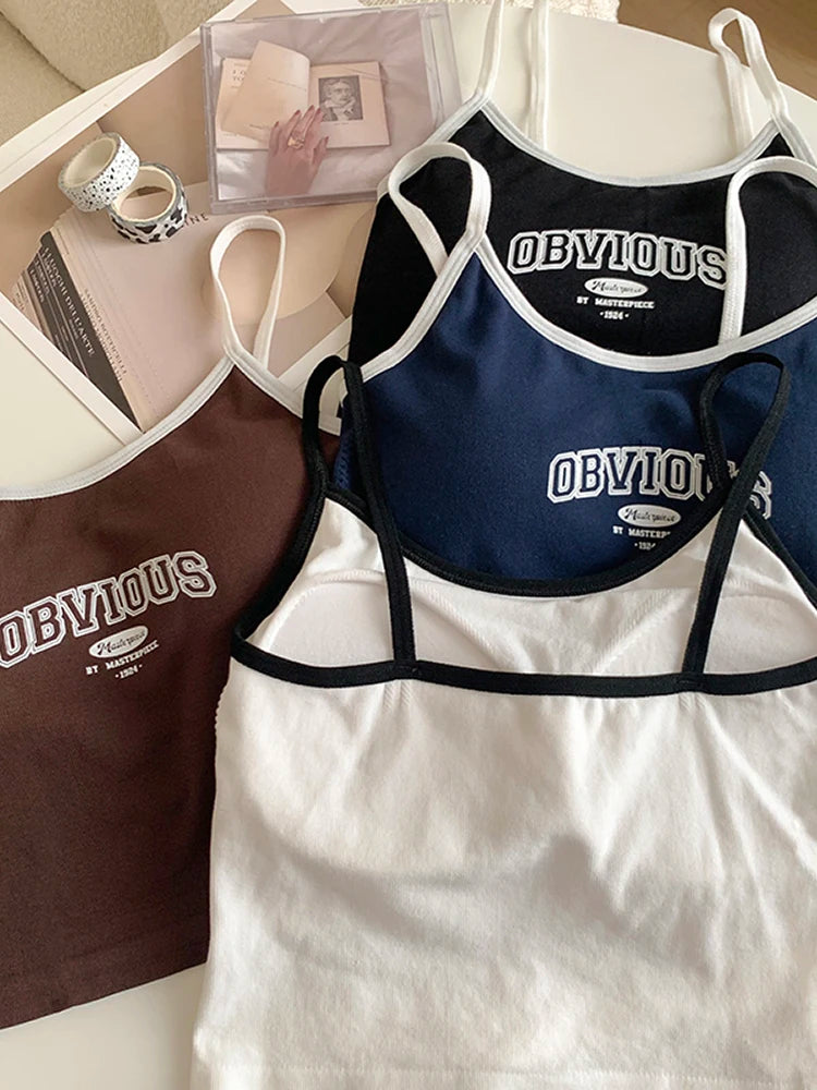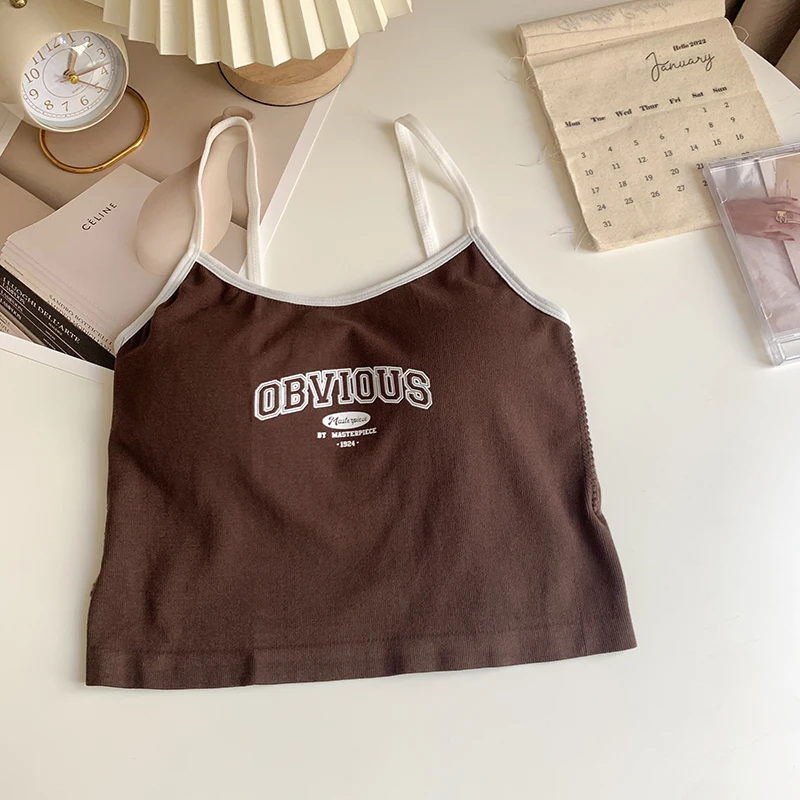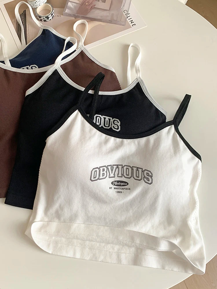 Women With Padded Bra Crop Tops O-neck Solid Crop Tops 2024 Summer Letter Printing Tops Spaghetti Camisole
