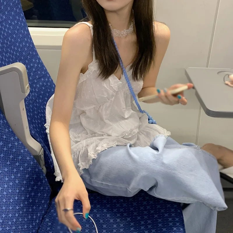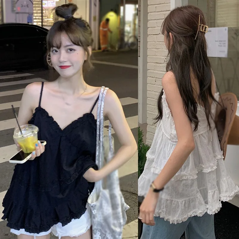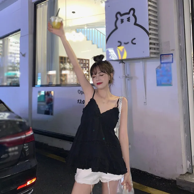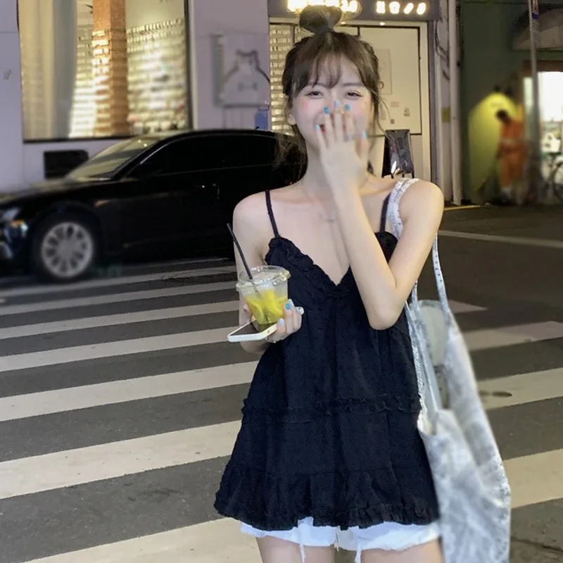 Women's Camisole Tank Tops Korean Style Sleeveless Shirt Sweet Casual Black/White Spaghetti Straps Vest V-neck