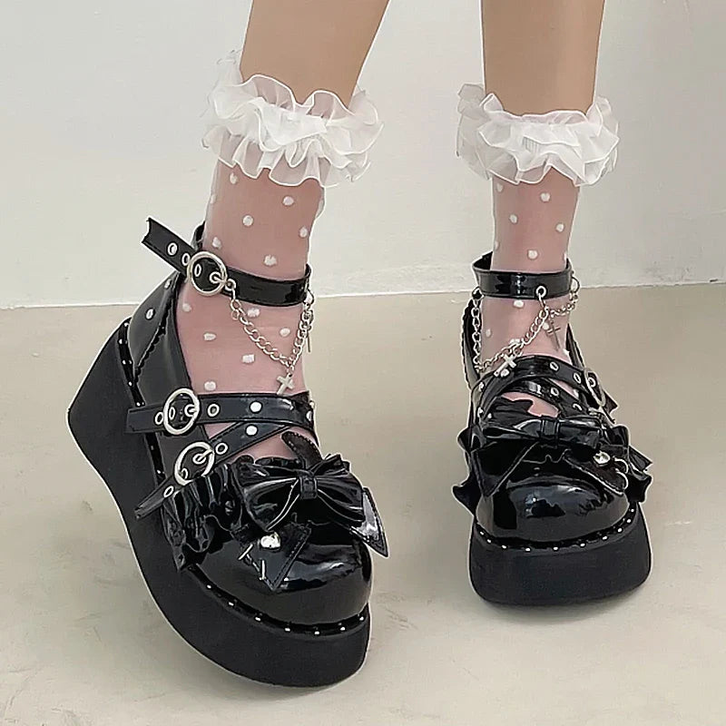 Y2K Metal Chains Punk Gothic Shoes Women Black Patent Leather Buckle Strap Wedges Pumps Woman Thick Platform Rivet Lolita Shoes