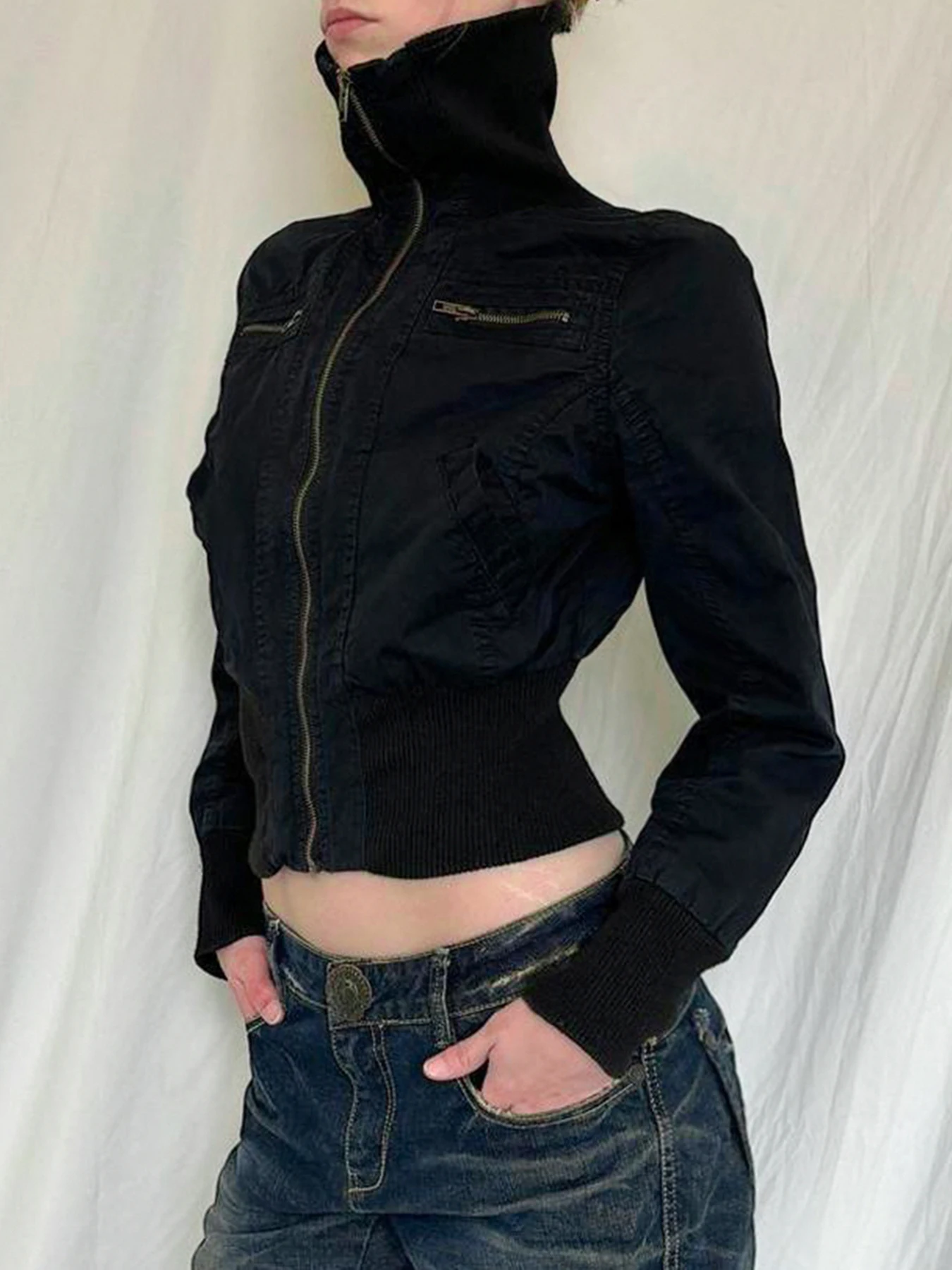 Y2k Vintage Streetwear Medium-high Neckline Zipper Jacket Tops All Match Waist Slimming Woven Short Coats Korean Solid